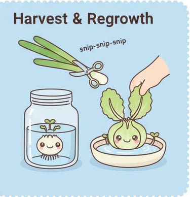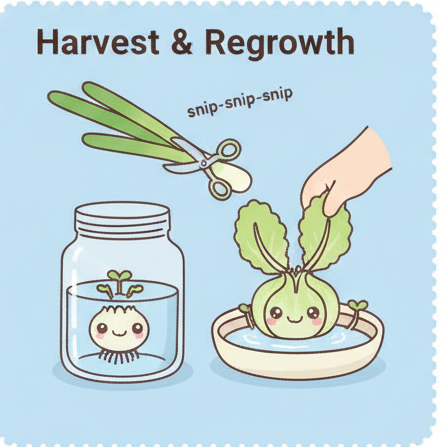 當新長出的部分達到適當長度(如蔥長到 15 公分),可以從頂部剪下食用。保留根部和基座,它們會繼續生長。